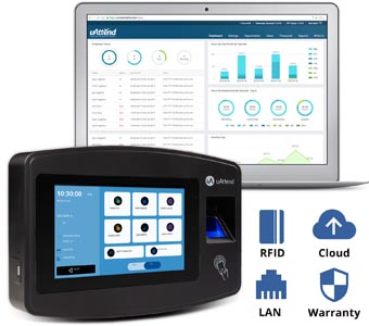 The uAttend JR2000 time clock is a cloud-connected biometric time clock designed for use with the uAttend cloud time and attendance platform. It records employee punches using fingerprint recognition, RFID badges, or PIN entry and transmits time data to the cloud for centralized tracking and reporting. Businesses use the JR2000 to improve payroll accuracy, reduce manual time entry, and standardize attendance tracking across departments or locations.